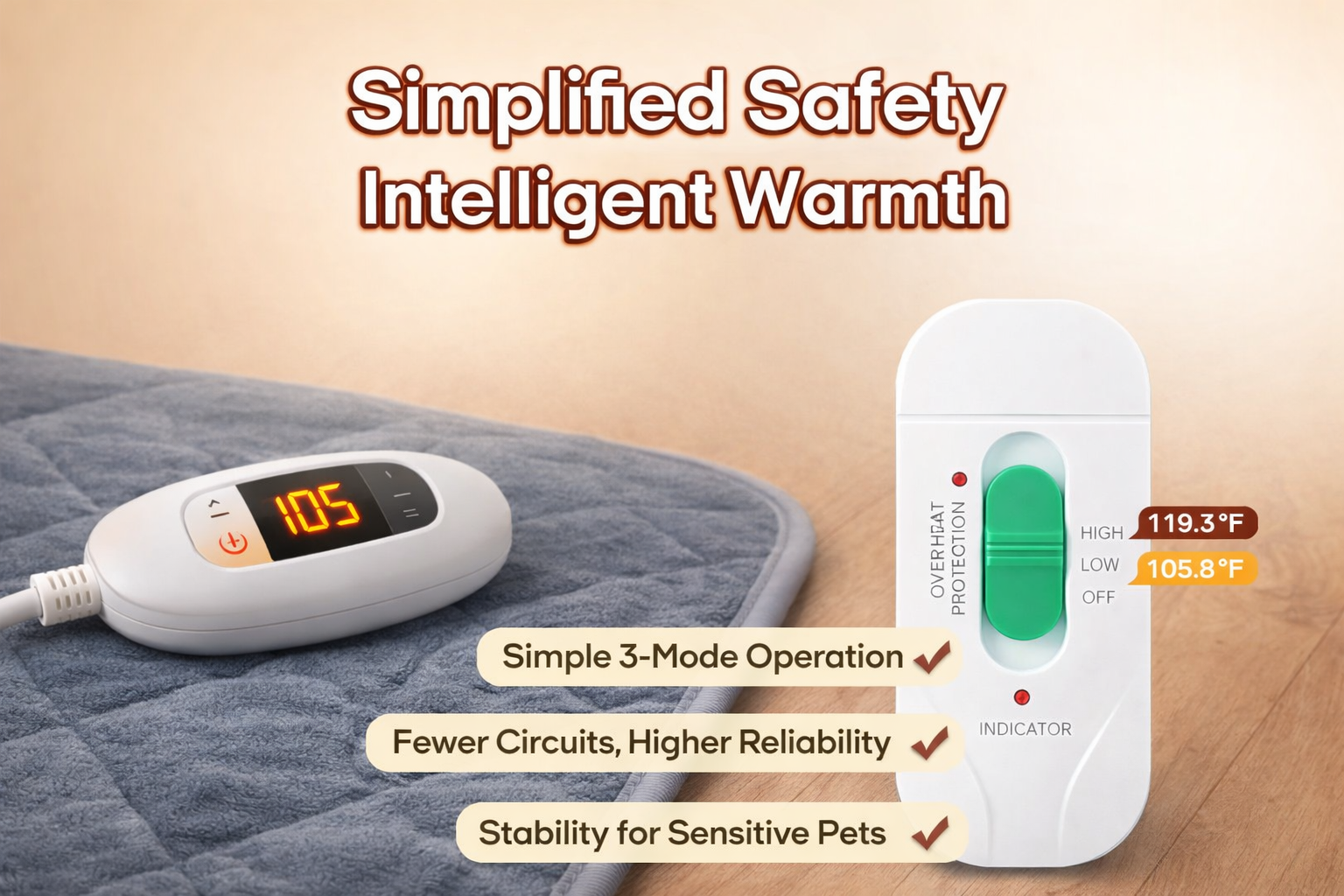 Start with LOW (105.8°F) for everyday comfort. Use HIGH (119.3°F) for senior pets with arthritis or during cold winter months. Your pet will show you what they prefer!